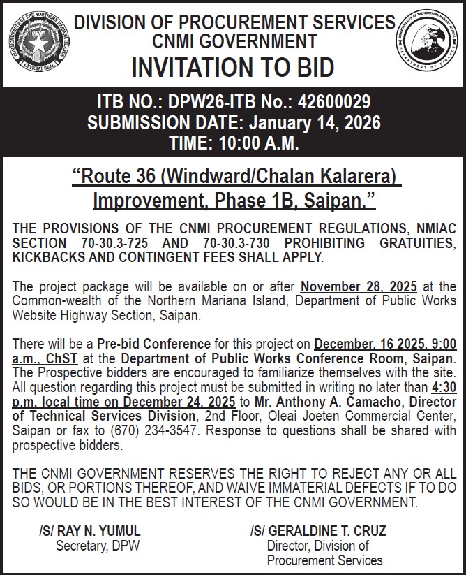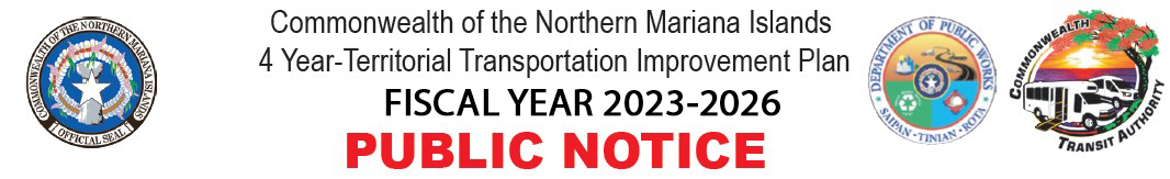 This is to inform the General Public that Department of Public Works, TSD – Highway will be conducting a Public Hearing on the CNMI 4-Year Territorial Transportation Improvement Plan (TTIP) on the following dates and locations: